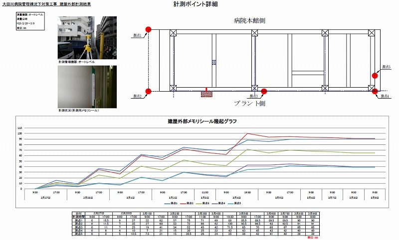 構造物は剛性もあり、ほぼ均等に沈下している不同沈下にみられる機能障害は起こっていなかったが、本館側が杭基礎構造だった為、EXP.J部分で段差が生じていた。病院という事もあり「車いす」やス「トレッチャー」などの走行がしやすいようにスロープでなくJOG工法で建物を全体的にリフトアップすることによって段差補修しバリアーフリー化を行うことになった。