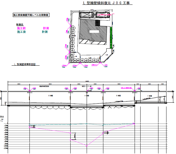 南西側の沈下修正を中心に、背面土の一部掘削を行い周辺地盤および隣接した宅地へ影響を与えることなく、コーナー部分の沈下、天端隙間、前面段差等を精度良く復元できた。