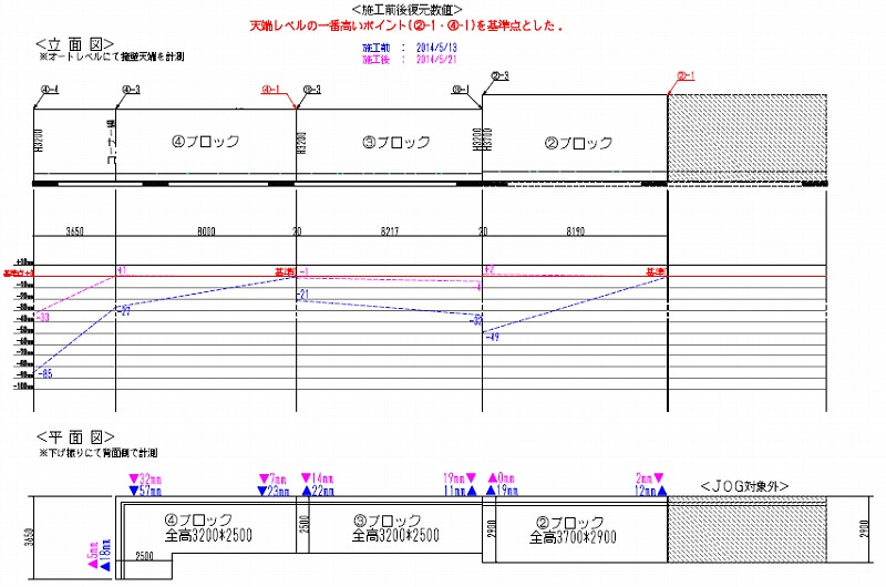実施施工では、擁壁の立ちが背面側に移動しやすいよう背面土を取り除いた。工事前に心配されていた近隣(前面側)への影響は、ヒービング、盤膨れなども全くなく無事に沈下修正を行う事ができた。