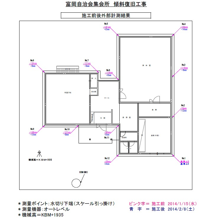変位は、北側倉庫(外部)基準点±0から集会室南西角で最大126mm沈下しているが建物としては、剛性を保った状態である。