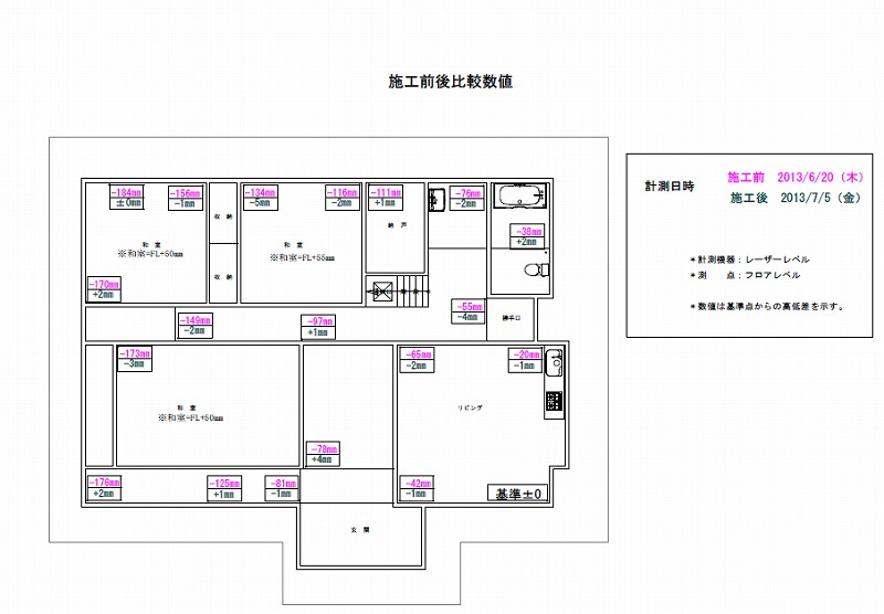 平鋼管や油圧ジャッキなどの構造物に局部的な力が作用する地切り縁切り作業を行わず。特殊注入のみだけで基礎下部地盤の改良工事と建物のリフトUP傾斜調整を行いました。